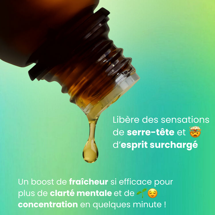- Huile essentielle de Menthe Poivrée (Inde): connue pour soulager les maux de tête et favoriser la concentration, son arôme frais, mentholé et revigorant est idéale pour stimuler et dynamiser l'esprit.