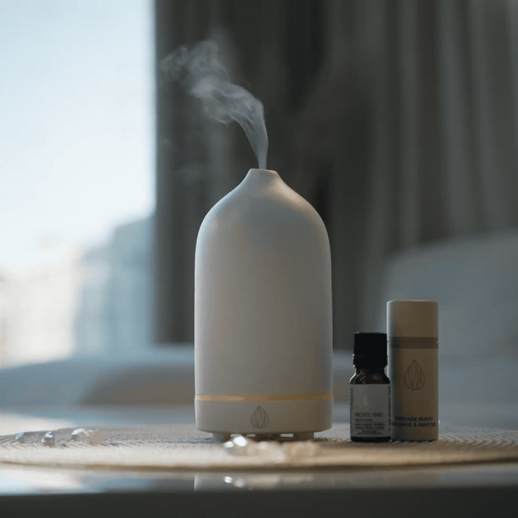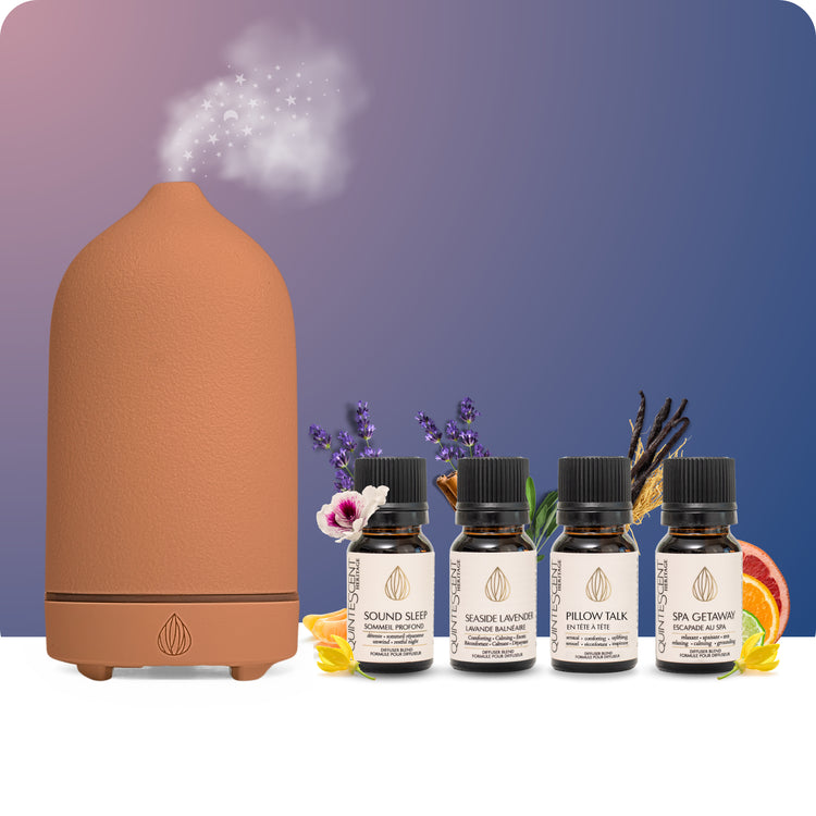 1 Shanti Diffuser in the color of your choice and a collection of 4x10ml essential oils carefully selected to promote a deep and peaceful night.