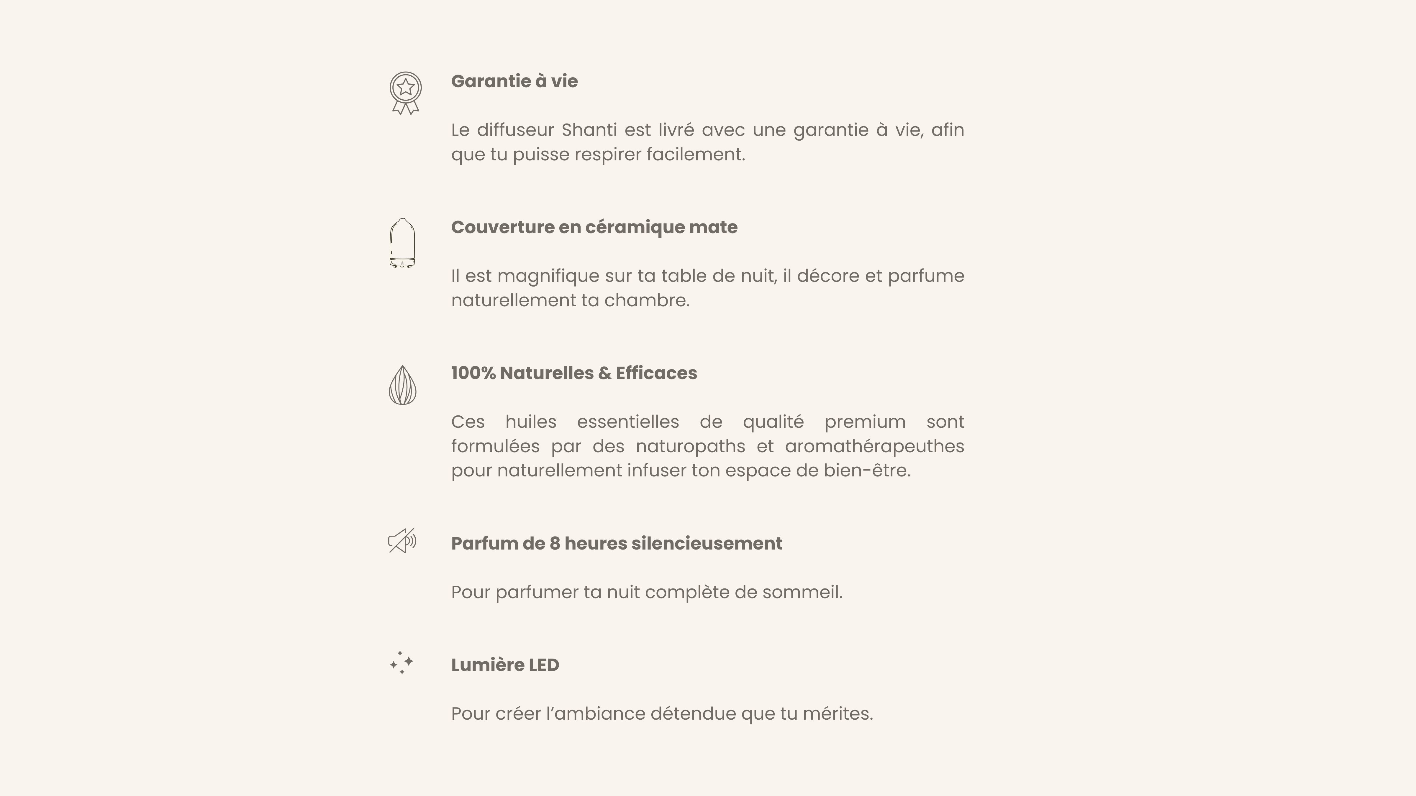 1 Diffuseur Shanti de la couleur de ton choix et une collection de 4x10ml huiles essentielles soigneusement sélectionnées pour favoriser une nuit profonde et paisible.
