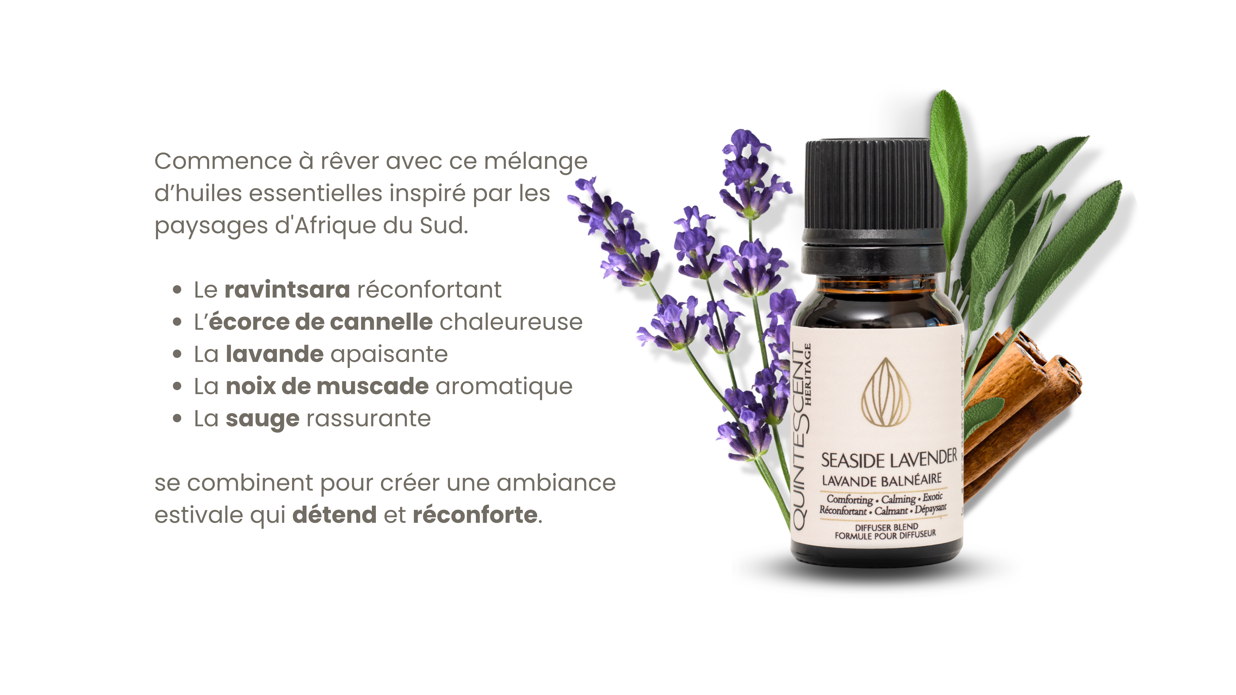 - Organic Lavender essential oil (South Africa): soothing and relaxing, reminiscent of lavender fields in bloom.